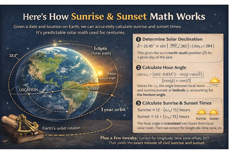 Earth rotates once every 24 hours and orbits the Sun once a year. We know the rate of that rotation, and we can model how axial tilt and orbital geometry change the Sun’s apparent path day by day. Using the trigonometry I describe below, we can write code that calculates the exact minute the Sun crosses the horizon for a given date and location.