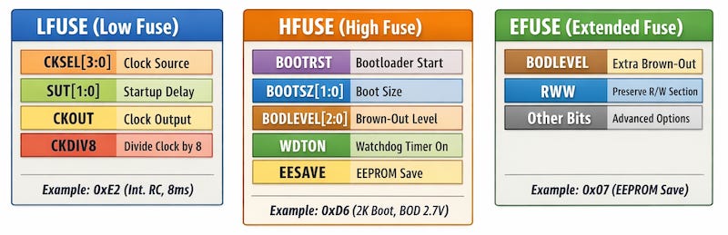 These three main bytes—LFUSE, HFUSE, and EFUSE—determine how the MCU powers up, which clock it uses, how it handles resets, and how it protects critical memory sections before any firmware even runs. Together, they ensure the chip operates safely and predictably. Understanding them is essential for diagnosing hardware issues, verifying proper startup behavior, and safely recovering chips that appear unresponsive.