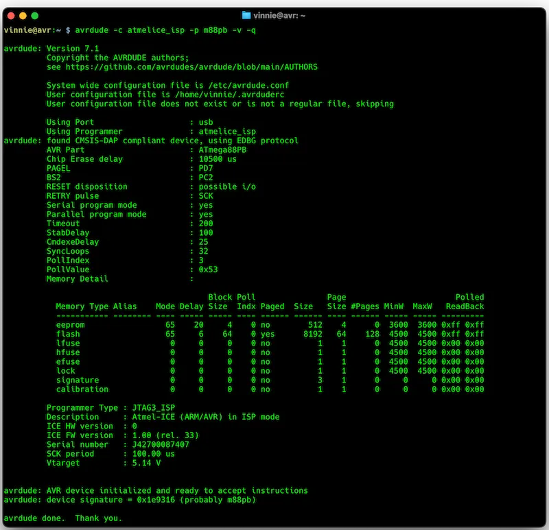 avrdude -c atmelice_isp -p m88pb -v -qThis command tells avrdude to use the Atmel-ICE in ISP mode (-c atmelice_isp), target an ATmega88PB (-p m88pb), print verbose output (-v), and quiet any progress messages (-q). Every detail you see here can give you insight into the board’s power, wiring, and chip health.