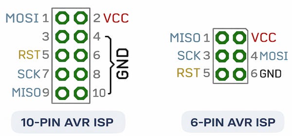 AVR programmers and target boards come with two common ISP connector formats: a 6‑pin and a 10‑pin layout. Event though the pinout is different, they both carry the same signals.