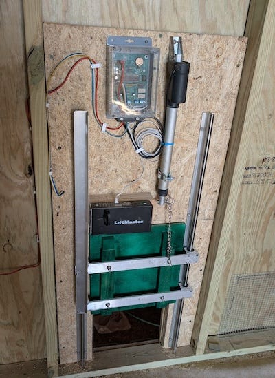 One other small detail: I used a short piece of chain between the actuator and the door, basically like a toilet flapper chain. That gives the linkage a little slack, which helps keep the door from driving hard against anything underneath it, including an unlucky chicken.