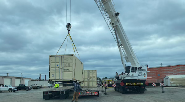 Unfortunately, the unloading process wasn’t as smooth as we had hoped. We could not find a local company to transport the containers; instead, we had to employ a crane company in Little Rock to unload them from the carrier. All this happened during a 5°F cold snap, which is apparently a big event in Arkansas.