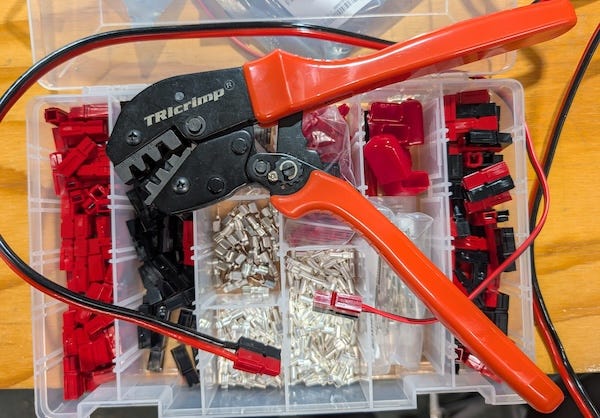 Hams love these because a properly crimped Powerpole will carry up to 45 A on 10 AWG wire. Even though I often run them at much lower current, I still use the proper crimping tool so a bad crimp does not bite me in the ass at the worst possible moment.