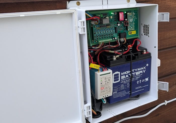 That led me to the Mean Well DRC series, specifically the DRC-100, which is designed as a security power supply for alarm and access control systems that must continue operating through brief power interruptions. The DRC-100 is not just an AC-to-DC regulated power supply. It also functions as a battery charger and a backup power controller in a single unit. This lets me run the system from line power when available while keeping a battery charged and ready to take over when the grid fails.