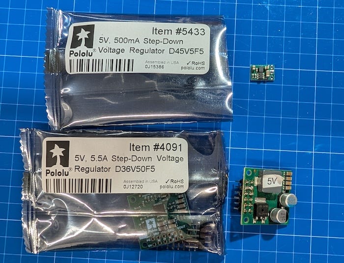 I got turned on to the Pololu regulators by a buddy at Apple who also spends his off time coaching kids in robotics competitions and working on model railroads. In that world, parts get abused, wiring isn’t perfect, and things are expected to work anyway.