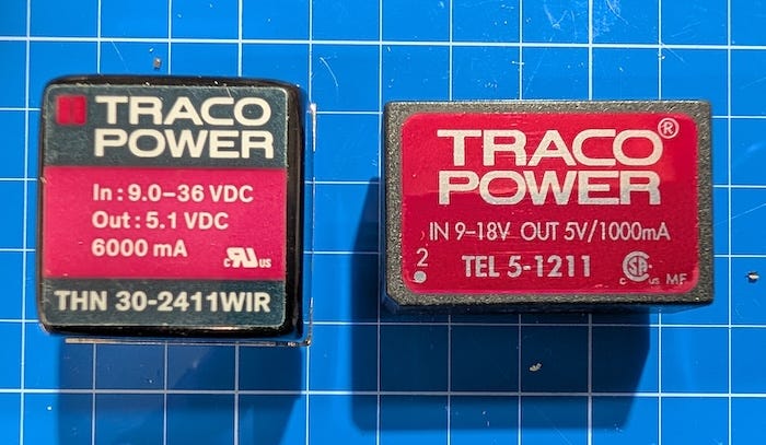 I chose the TRACO converters because they are designed as embedded power components rather than general-purpose buck regulators. They provide full isolation, tolerate wide input voltage ranges, and are rated for continuous operation. Several of the parts I use also carry railway ratings, indicating tolerance for electrical transients, temperature extremes, and long service life.