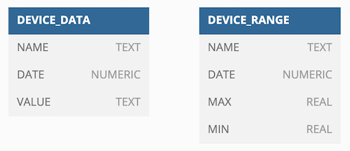 The server defines two tables in the database: DEVICE_DATA is used to track any significant changes recorded from the devices, and DEVICE_RANGE is used to track the high and low values of the day.