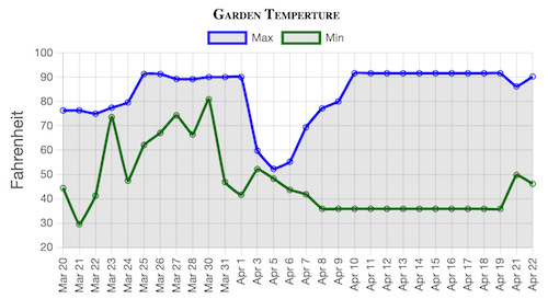 The first entry on 1742515182 shows a MIN of 6.90585 and a MAX of 24.6101. This means that on 3/20/25, the garden temperature dropped to 44.4°F and had a high of 76.2°F. The next day, it fell to 29.5° and reached a high of 76.2°F. (Yeah, welcome to Arkansas!)
