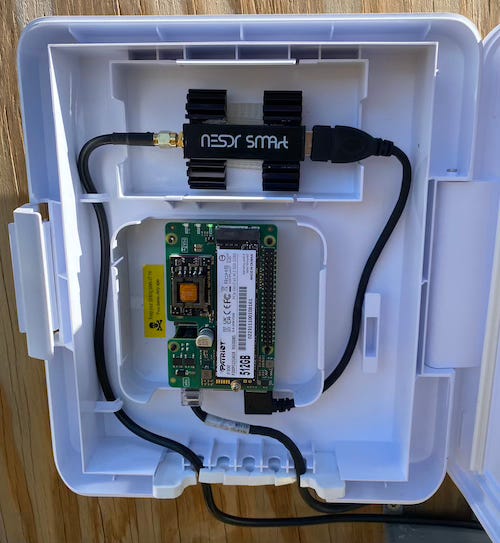 Using industrial Velcro strips, I mounted the Raspberry Pi, the active cooler, HatDrive POE+, and SDR. Plenty of space for air movement, and the final product looked very clean.
