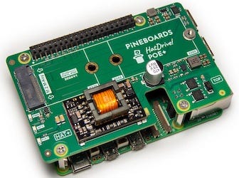 Instead of running a separate power supply, I chose to use a POE adapter, specifically the HatDrive! POE+ from pineboards.io. Their design employs an isolation transformer to derive power from Ethernet, which is essential for outdoor applications. The HatDrive! POE+ also has an M.2 M-Key connector for an NVMe card, eliminating the need to boot up from the MicroSD card.